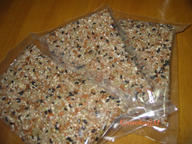 玄米・緑米・赤米・黒米の餅米と粳米の7種の苗を混植して育てたものです。