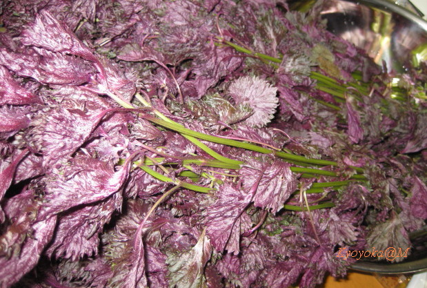 今日は赤紫蘇を買ってきたので、葉を選別し、やわらかい紫の縮緬のような葉を選んで、