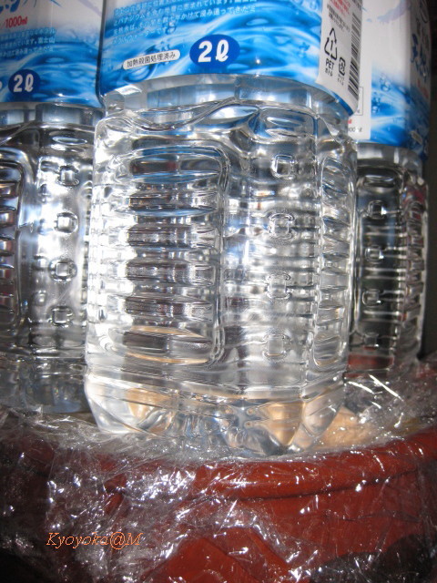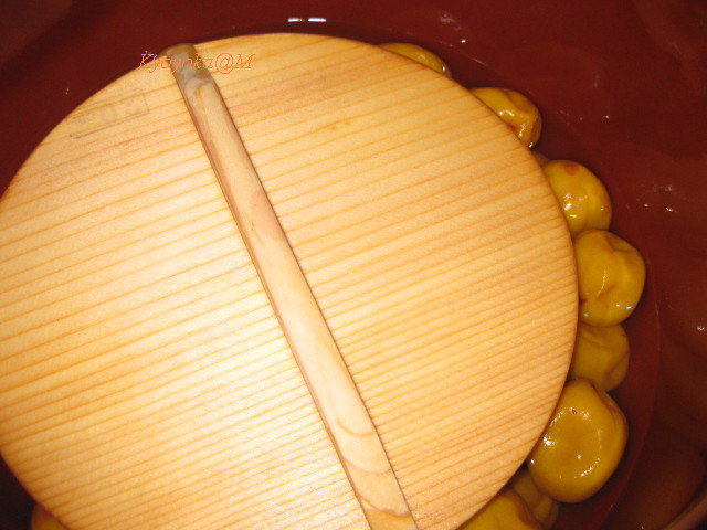 上からは重石としてミネラルウォーター2Lサイズが4本。 梅の重量と同量程度の重石です。