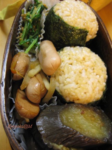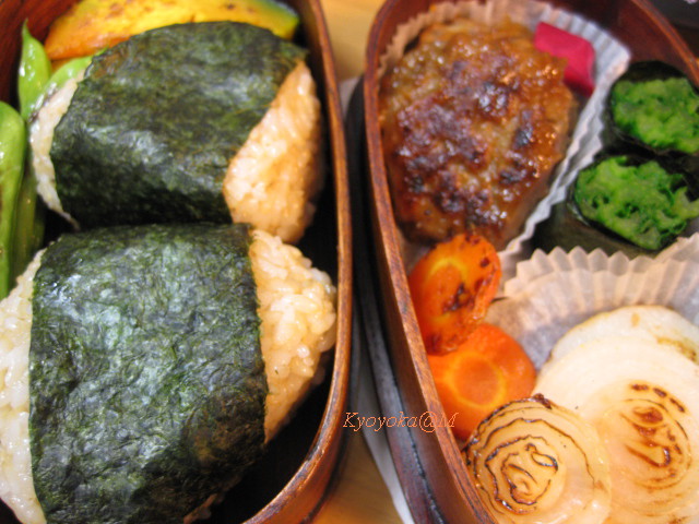 おむすびがいつもの厚みだったので、2段弁当の中で、ぎゅっと圧縮されて、食べる時には、少しひびが入っていたとか。