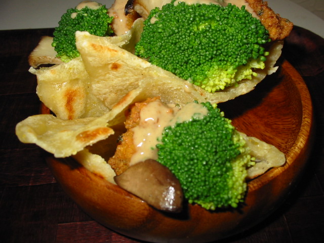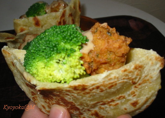 今日は半分に切ったピタパンの真ん中にブロッコリとエリンギとともにはさみ、タヒニ(練りごま)ソースをかけました。